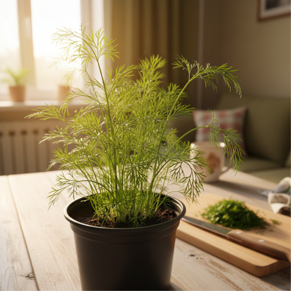 Домашній кріп значно пишніший та ароматніший за куплений. Він рівномірно росте в горщику, формує густу зелену “шапку” і чудово відновлюється. Ідеальний для картоплі, риби, салатів і консервації. У квартирі він дає швидкий, соковитий урожай навіть взимку.