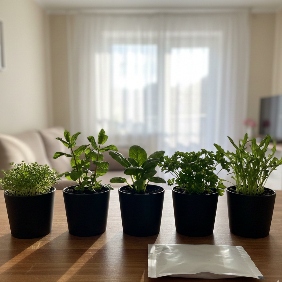 Наші готові набори чудово ростуть у звичайних кімнатних умовах — без теплиць, ламп та зайвого догляду.